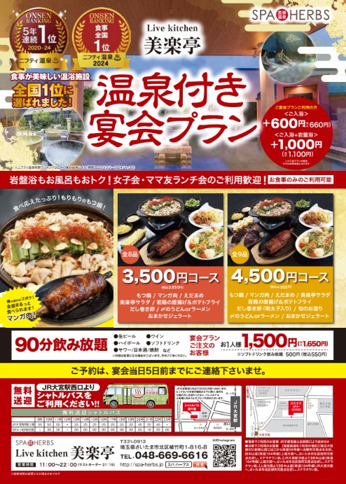 レストラン美楽亭ではお風呂とお食事でセットでお得な宴会プランのご予約を受け付け中!!